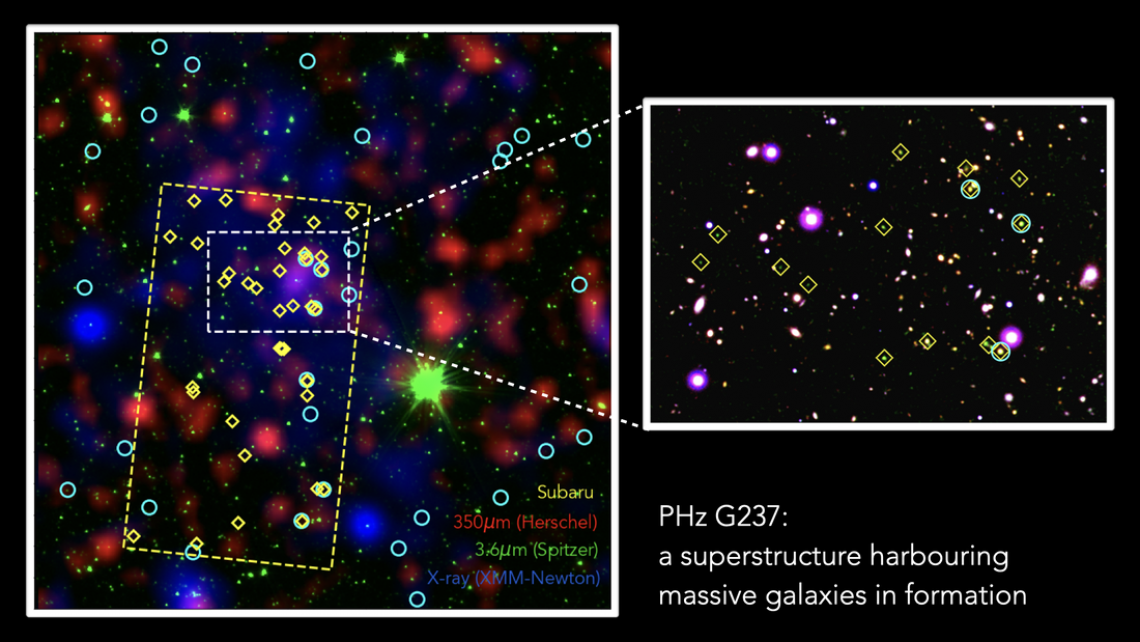 Astronomers have discovered a structure thought to be a “protocluster” of galaxies on its way to developing into a galaxy supercluster. Observations show the protocluster, which is located 11 billion light-years from Earth, as it appeared when the universe was 3 billion years old, when stars were produced at higher rates in certain regions of the cosmos. Several instruments joined forces to produce this image of the G237 protocluster, identifying its galaxies in different colors representing different wavelengths of observations. The image on the right zooms in on the central region of this massive galaxy “shipyard.”