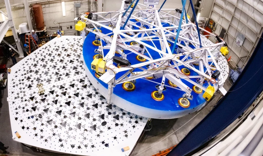 Inside the Richard F. Caris Mirror Lab underneath the University of Arizona football stadium, a giant glass mirror covered in a blue, translucent protective coating rests on a hollow steel platform painted white. Engineers and technicians duck as they enter and exit the structure to check on wires, electrical connections and various mechanical hardware components. To read more, click HERE.